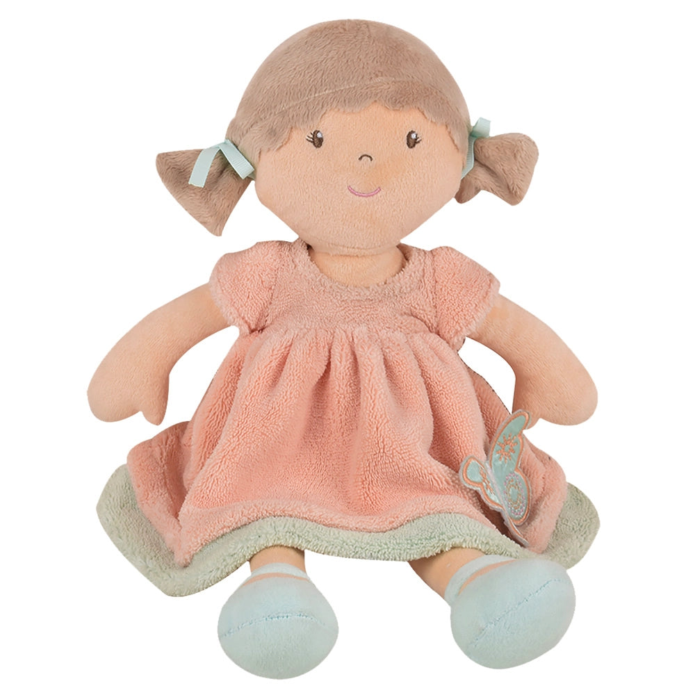 Pia is a soft, huggable doll in a bright peach plush dress with a 3D butterfly, matching pastel shoes, and ribbons.