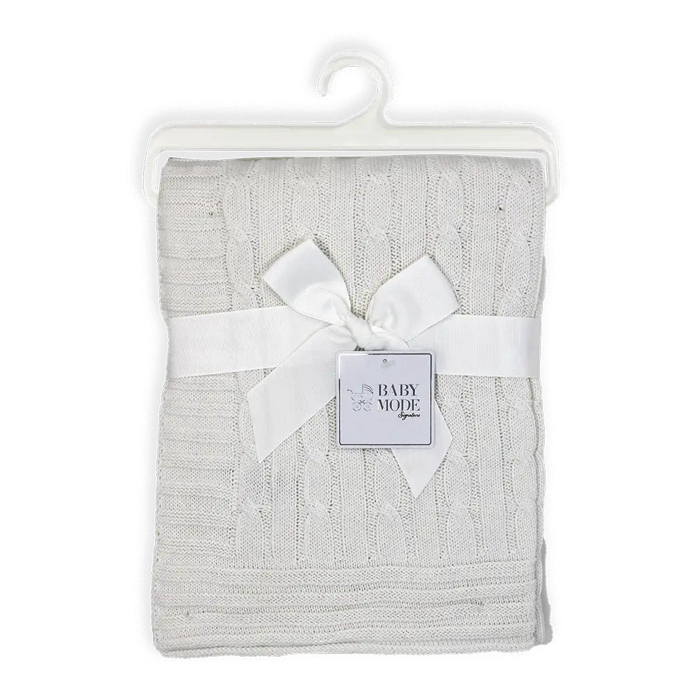 An instant classic, this beautiful baby blanket in pure white is sure to delight. 100% cotton, cable knit construction. Measures 30" x 40".