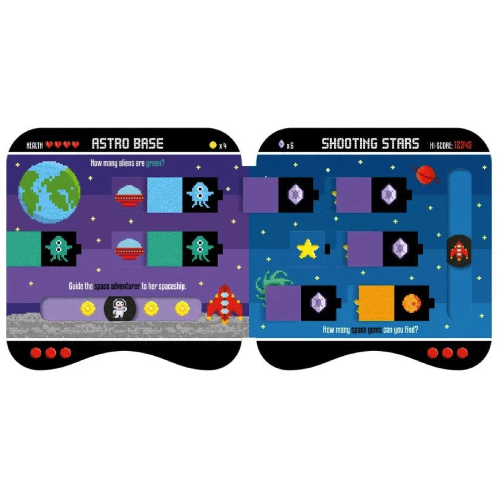 Each page offers a different play experience, with trails, flaps, and sliders imitating classic retro video games.