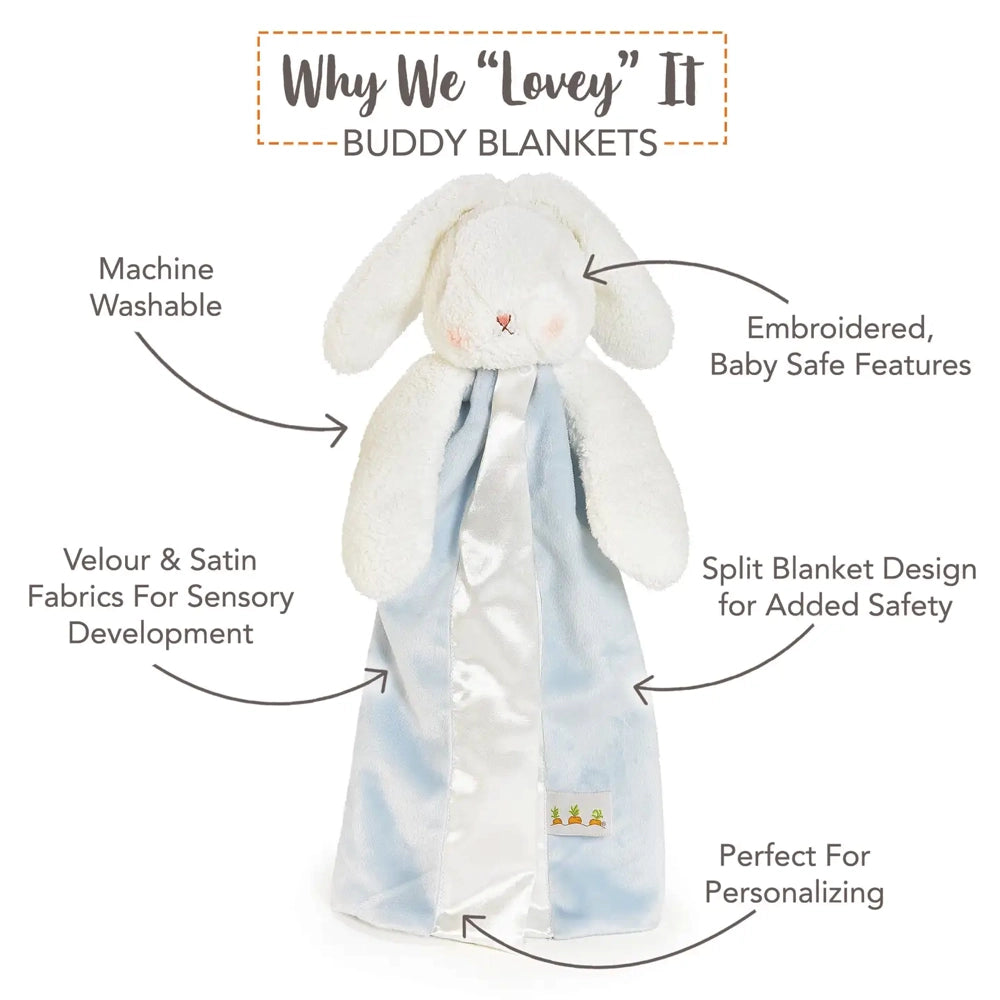 Meet Simple Bud Bunny, a timeless take on our beloved Buddy Blanket – now with a simpler, more streamlined design. Bud features a white plush bunny head and floppy arms, with baby -safe embroidered features for extra snuggles and sweet dreams. With soft Blue velour blanket body is trimmed with silky satin, perfect for soothing little hands and encouraging tactile development. A gentle first friend for baby’s earliest memories.