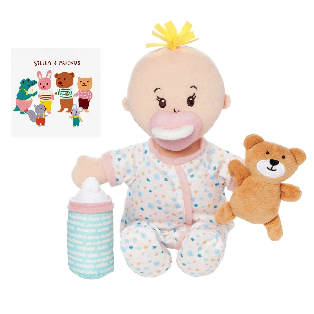 The Love, Stella Sleepy Time dolls are the perfect size for holding, hugging, and nurturing role play to foster social and emotional development. Dolls are 100% soft with a soothing light lavender scent. The doll's bottom is lightly weighted and designed to sit unassisted - perfect for playtime! Sleepy Time doll has embroidered features, fabric hair, a plump tummy, and a cute little belly button. The set includes a signature magnetic pacifier, a magnetic bottle, a teddy bear companion, and a mini paper bedtime picture book. Clothes are removable and feature hook-and-loop closures for supporting elementary dressing skills.