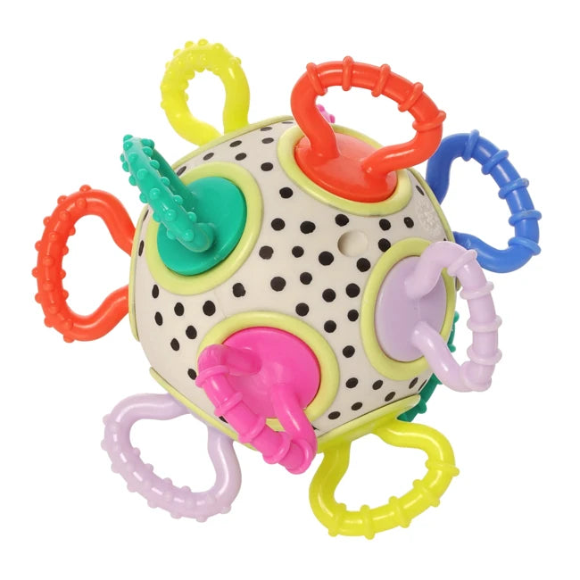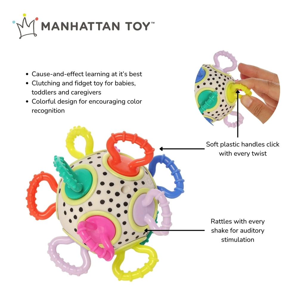 The colorful Click Clack Colorpop features soft plastic handles that click with every twist. The center ball is filled with tiny beads, so it rattles with every shake. The perfect fidget toy for babies and young toddlers!