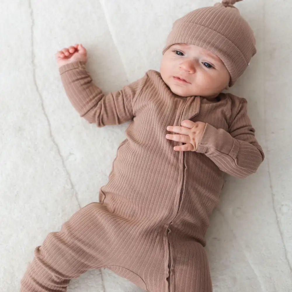 Your child will love snuggling up in our ribbed organic cotton sleepers! Our top-selling footies are incredibly soft and gentle on even the most delicate skin. Pair with one of our matching headbands or knot hats to complete the look.
