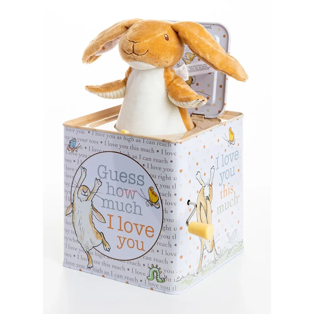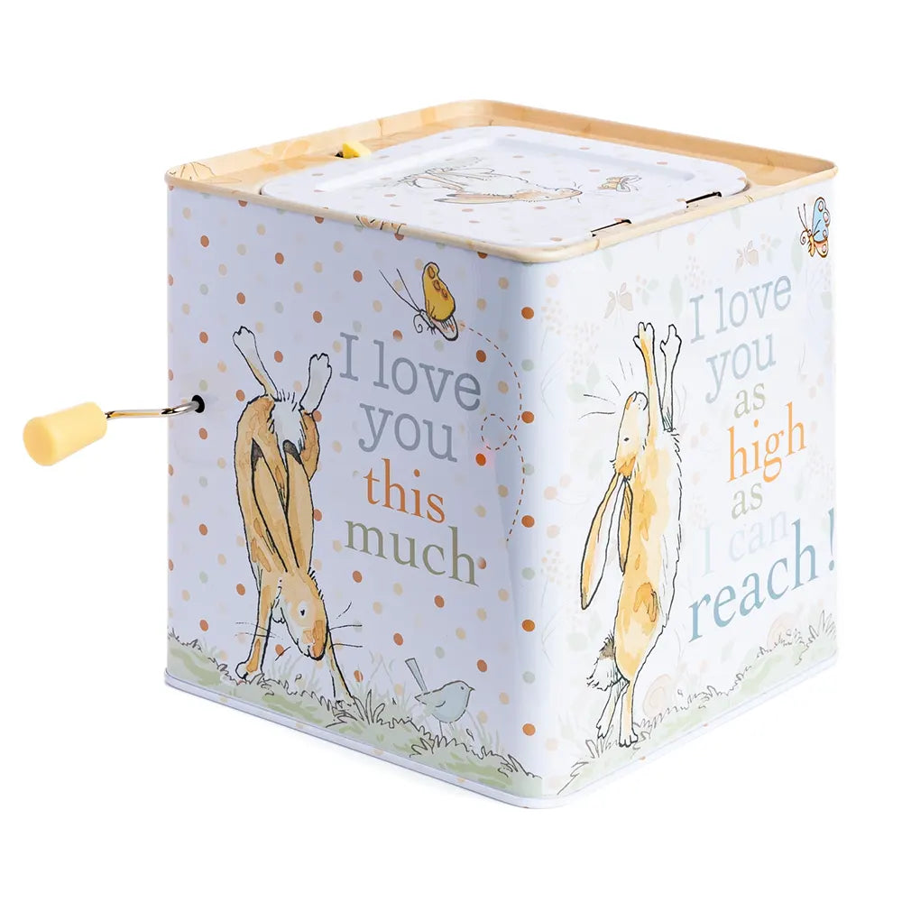 Hear Pop Goes the Weasel and wait for the surprise as Guess How Much I Love You™ Jack-in-the-Box Little Nutbrown Hare pops up to say hello. The box features graphics from the Guess How Much I Love You™ book and measures 5.5 inches tall. The Guess How Much I Love You™ Jack-in-the-Box can be displayed on the nursery shelf when baby is sleeping.