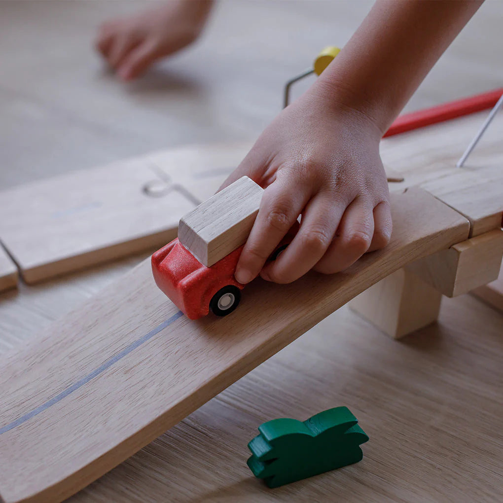Enhance your pretend-play with the Road System set! Complete with 27 track pieces, 1 bridge, 1 car, 1 light, and 4 bushes (34 pieces in total). Children have everything they need to bring their pretend city to life! Sustainably made in Thailand using chemical-free rubberwood, formaldehyde-free glue, organic pigments and water-based dyes. Ages 3y+