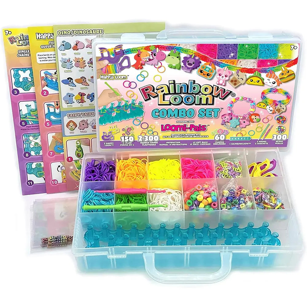 The Rainbow Loom Combo Set features 2300+ Latex Free Rubber Bands, 60 Charms, 450 Beads and Clips, 1 Rainbow Loom 2.0, 2 Happy Loom, 2 Hooks, 12 Gift Bags all in an organized case