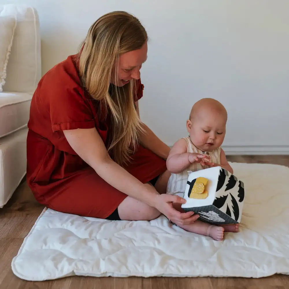 Fox, trees, the woodland sleeps! So much to do and see in one large block. This soft fabric block is designed to delight baby's developing senses with high-contrast graphics, textures, taggies, and crinkles. Featuring multiple scenes and patterns of woodland life and animals.