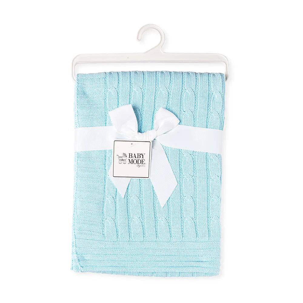 An instant classic, this beautiful baby blanket in bonny blue is sure to delight. 100% cotton, cable knit construction. Measures 30" x 40".